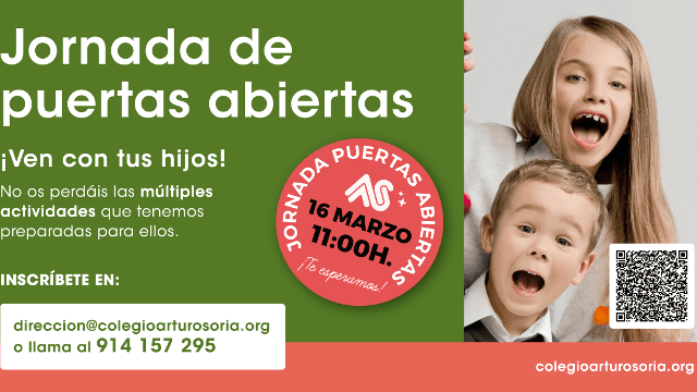 ¡ No te pierdas la Jornada de Puertas Abiertas !📅 Sábado 16 marzo ⏰11:00Ven con tus hijos, tenemos muchas actividades preparadas para ellos 😀🤹 👨‍👩‍👦‍👦https://colegioarturosoria.org/contactar/